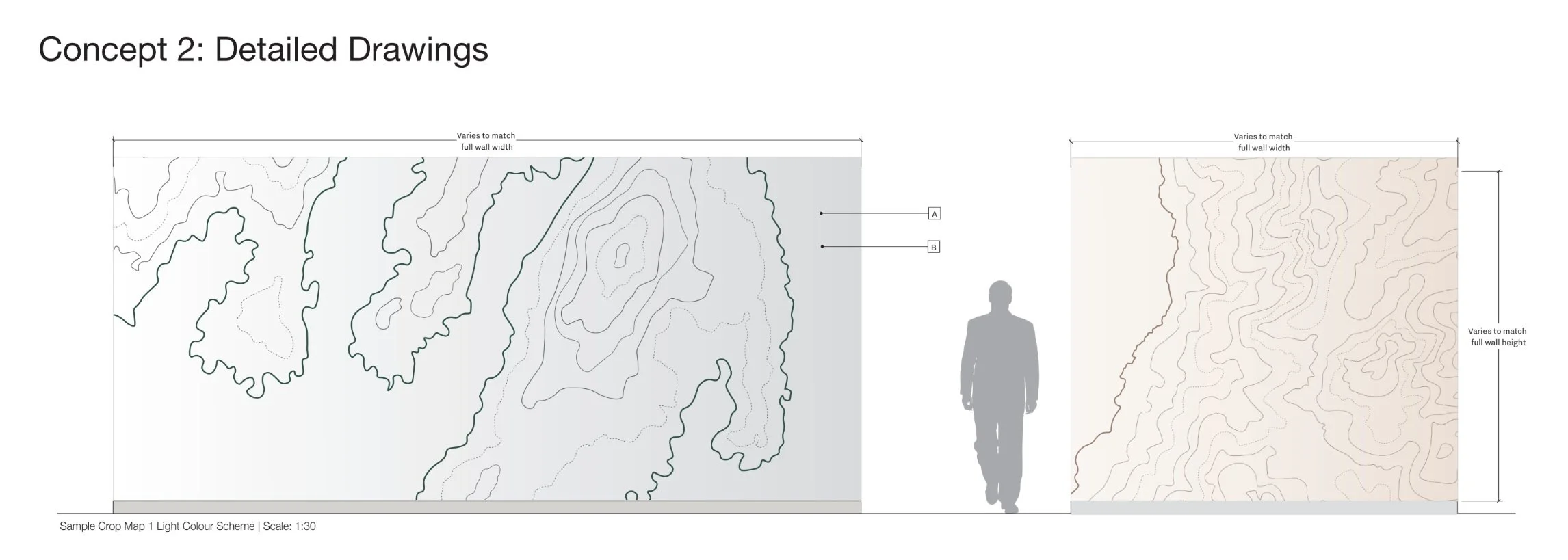 I conceptualized and wrote all the design and material specifications for the “Modern Map” concept, which was inspired by topographic maps of the regions of BC.