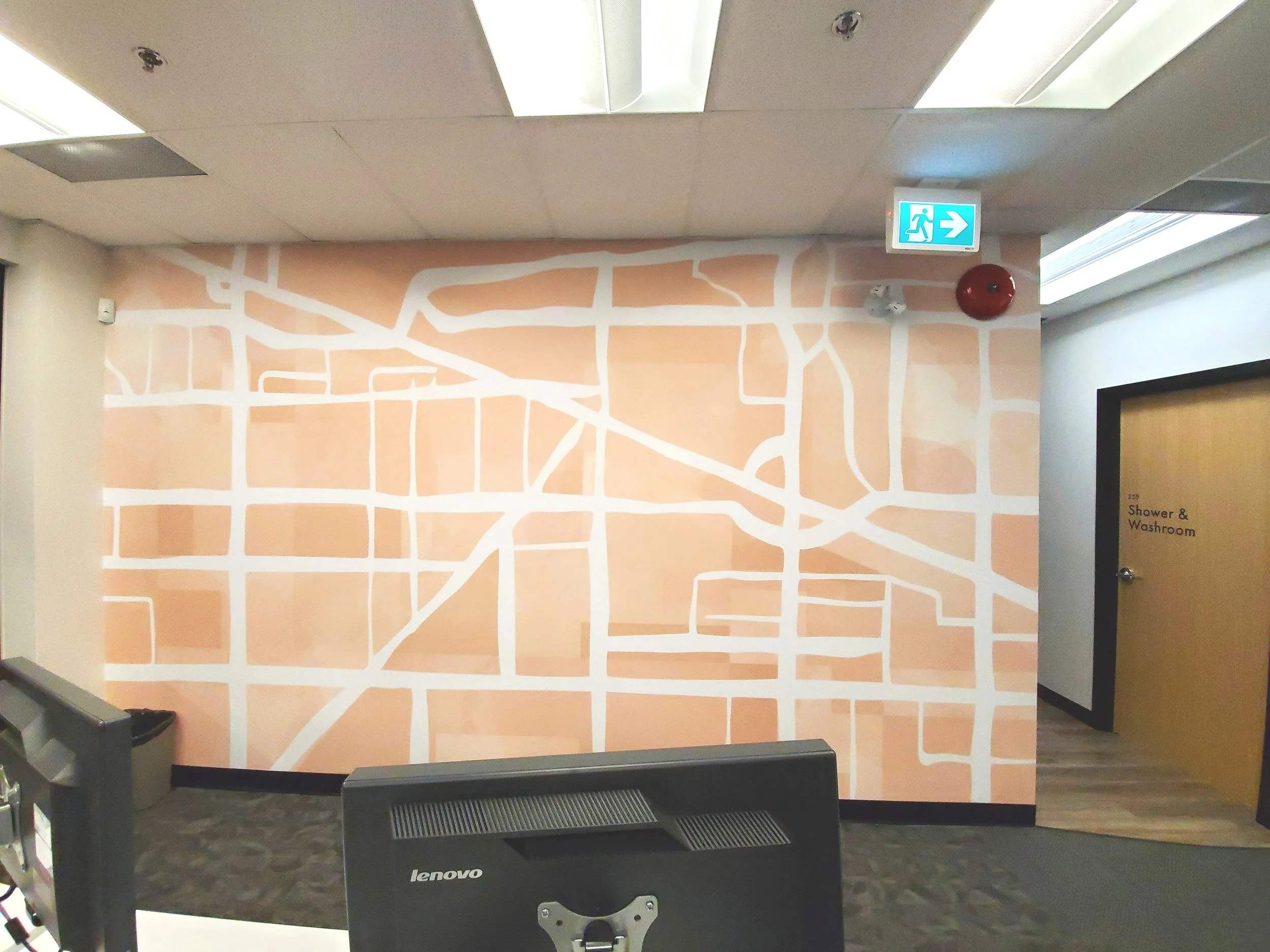 Government of British Columbia (Various Ministry Offices) - Custom wall graphics and window film are often inspired by nature, geography, and local flora. This office features an abstract watercolour map of the surrounding municipality.