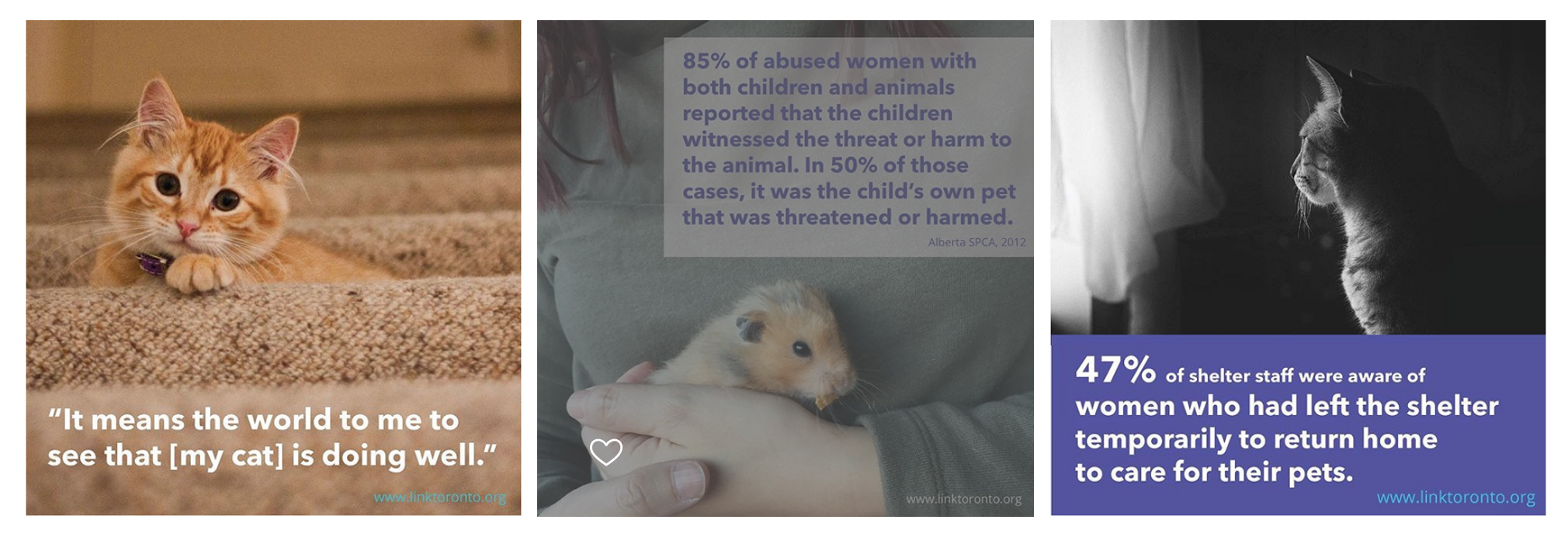 Link Toronto is an organization acting to address the link between domestic violence, child abuse, animal abuse, and elder abuse in Toronto. Their SafePet Program coordinates foster care for the pets of survivors fleeing situations of domestic violence.